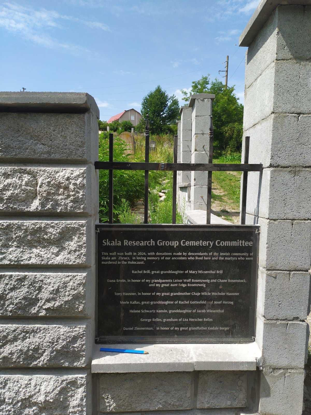 | The Skala Research Group (SRG), whose members are individuals with ancestors who lived in the Skala shtetl, is happy to announce the building of a new wall to protect the Jewish cemetery in Skala Podil'ska, Ukraine. A wall had previously been erected by members of the Skala Benevolent Society when its president was Max Mermelstein z”l. This wall, built almost 30 years ago, had deteriorated and needed to be replaced. The new wall was funded by members of the SRG and the European Jewish Cemeteries Initiative (ESJF), led by Philip Carmel and funded by the European Union, which gets the majority of its funds from Germany. The building of the new wall was managed by Kyiv resident Alex Bessarab and was overseen by ESJF. SRG members contributed most of the funding. |