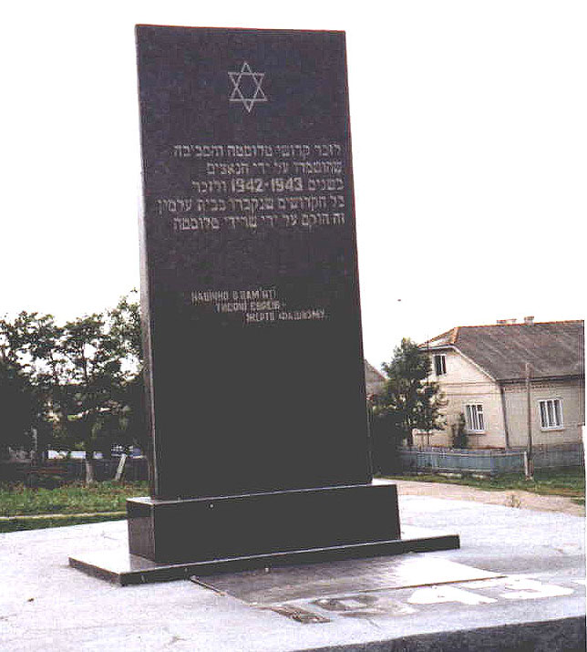 This photograph of the Holocaust memorial in the Tolstoye (Tluste) Jewish cemetery was taken by Tosia Szechter Schneider during her 1997 visit to Horodenka, Tolstoye, and vicinity. Mrs. Schneider is a survivor from Horodenka, some of whose Jews--including her mother--were sent to the Tluste ghetto and died there. The Hebrew inscription, translated by Tosia Schneider, reads: "In memory of the martyrs of Tluste and surroundings who were annihilated by the Nazis in the years 1942-1943 and to remember all the martyrs who are buried in this cemetery. Erected by the survivors from Tluste." [The image was downloaded from the web, processed, and cropped.]