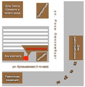 The place shaded on the sketch was until August 1941 densely built up by the houses and homesteads where lived,primarily, the Jews. In August 1941 when the Red Army was retreating one of our countrymen ( a Jew) set them on fire order prevent the Germans to get them.