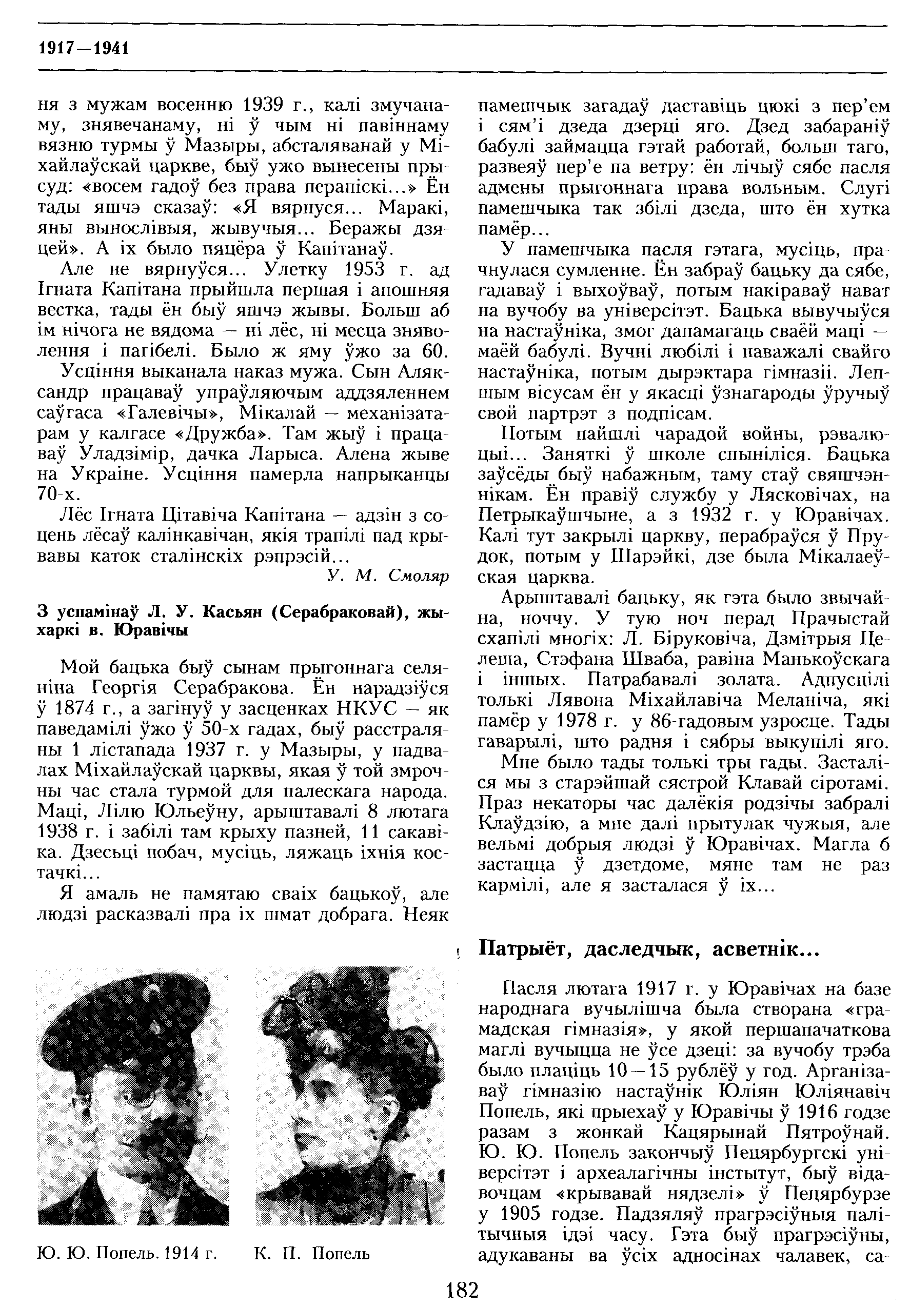 В конце лета 1938 г. в м. Юревичи органами НКВД был арестован житель м-ка Юревичи Попель Юлиан Юлианович. B настоящее время до нас, жителей м-ка Юревичи, дошли слухи о том, что Попель Ю. Ю. обвиняется в том, что в 1920 г. при налете банды Балаховича он как будто бы был их посредником, соучастником. Мы, все жители м-ка Юревичи, утверждаем следующее.