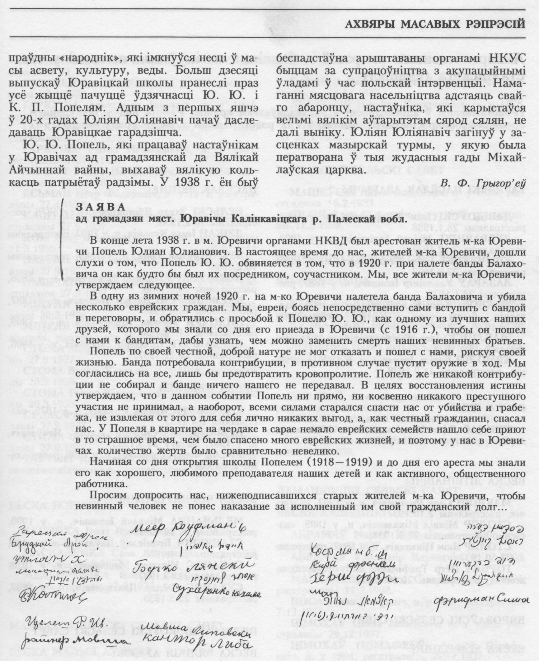 B одну из зимних ночей 1920 г. на м-ко Юревичи налетела банда Балаховича и убила несколько еврейских граждан. Мы, евреи, боясь непосредственно сами вступить с бандой в переговоры, и обратились с просьбой к Попелю Ю. Ю., как одному из лучших наших друзей, которого мы знали со дня его приезда в Юревичи (с 1916 г.), чтобы он пошел с нами к бандитам, дабы узнать, чем можно заменить смерть наших невинных братьев. Попель по своей честной, доброй натуре не мог отказать и пошел с нами, рискуя своей жизнью. Банда потребовала контрибуции, в противном случае пустит оружие в ход. Мы согласились на все, лишь бы предотвратить кровопролитие. Попель же никакой контрибуции не собирал и банде ничего нашего не передавал. В целях восстановления истины утверждаем, что в данном событии Попель ни прямо, ни косвенно никакого преступного участия не принимал, а наоборот, всеми силами старался спасти нас от убийства и грабежа, не извлекая от этого для себя лично никаких выгод, а, как честный гражданин, спасал нас. У Попеля в квартире на чердаке в cарае немало еврейских семейств нашло себе приют в то страшное время, чем было спасено много еврейских жизней, и поэтому у нас в Юревичах количество жертв было сравнительно невелико. Начиная со дня открытия школы Попелем (1918-1919) и до дня его ареста мы знали его как хорошего, любимого преподавателя наших детей и активного, общественного работника. Просим допросить нас, нижеподписавшихся старых жителей м-ка Юревичи, чтобы невинный человек не понес наказание за исполненный им свой гражданский долг.