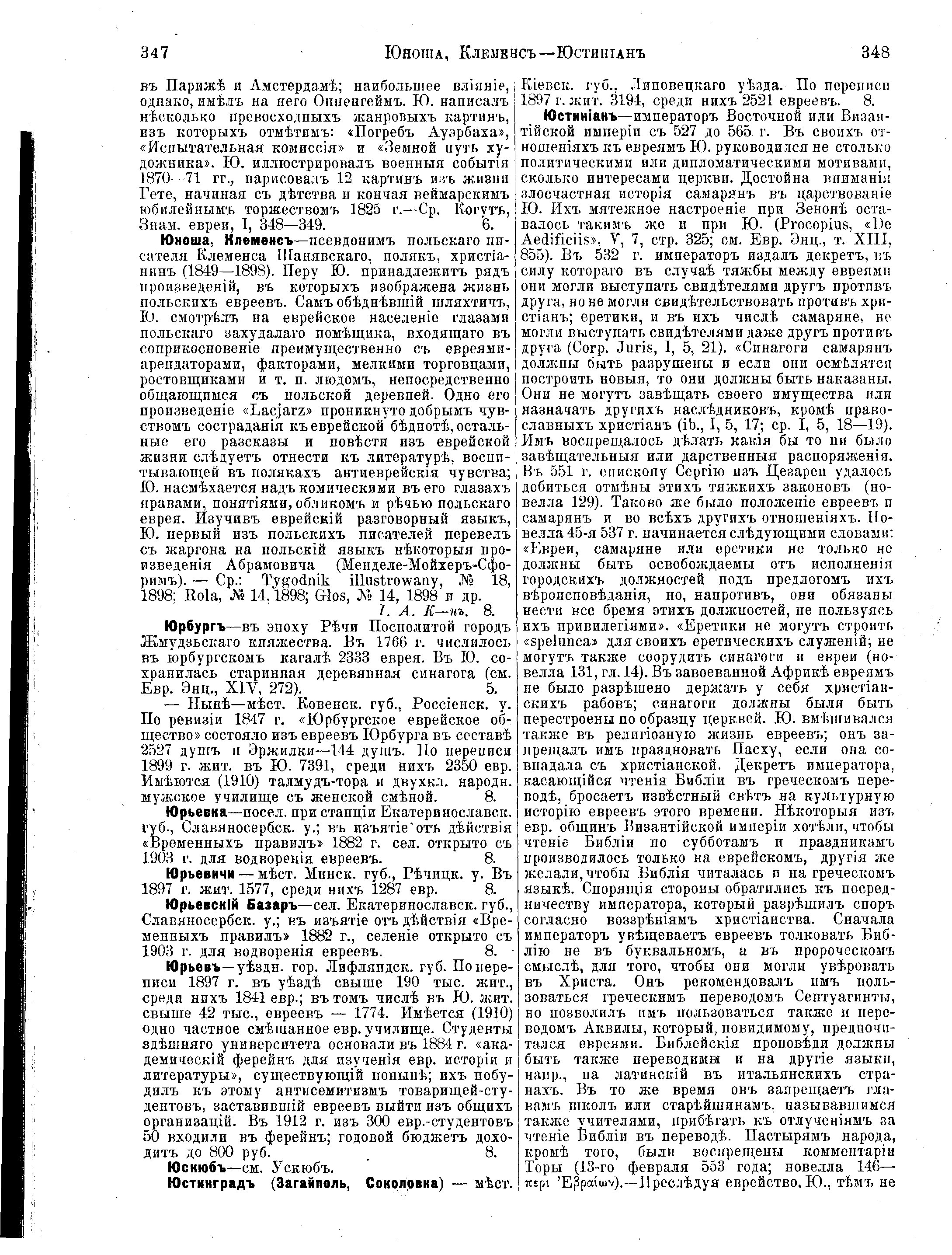 This 16-volume Jewish Encyclopedia in Russian was published in St. Petersburg by Brockhaus and Efron between 1906 and 1913. The section (Раздел) number at the end of the article specifies the article's author. For this Yurevichi article, the section 8 editor was Юлий Исидорович Гессен (Julius Isidorovich Hesse).