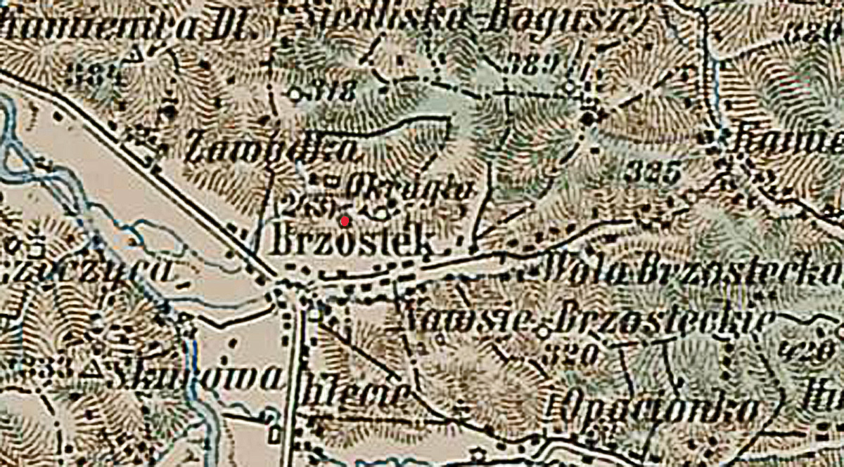 A section of the 3rd Military Mapping Survey of Austria-Hungary showing Brzostek. Published c. 1910. The scale: 1:200 000 is large enough to show detailed views of the smallest village and even the rows of houses.