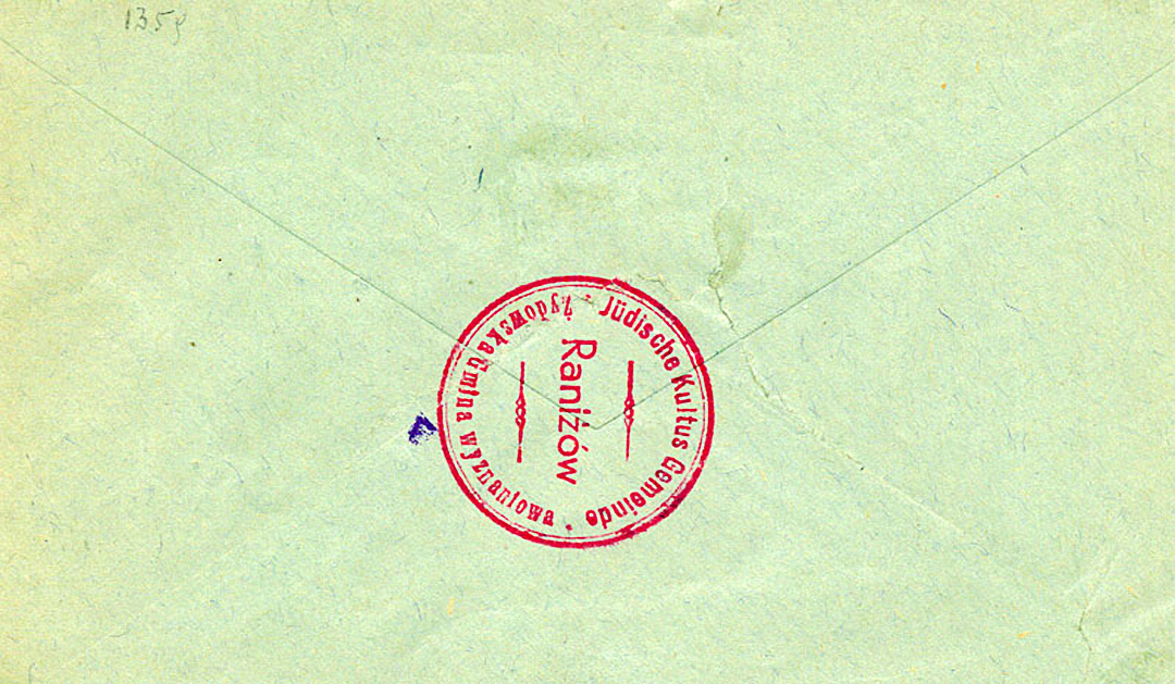 Cover sent by the Judische Kultus Gemeinde Raniźów to theKreishauptmannschaft in Reichshof