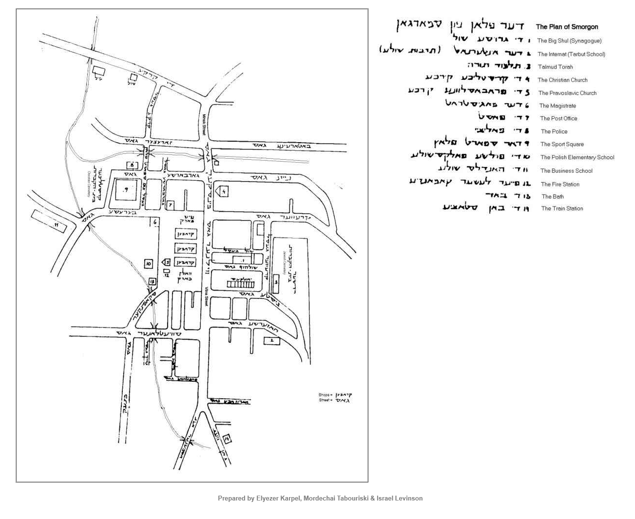drew a map in Hebrew and Yiddish of what Smorgon' looked like in 1941. This version of