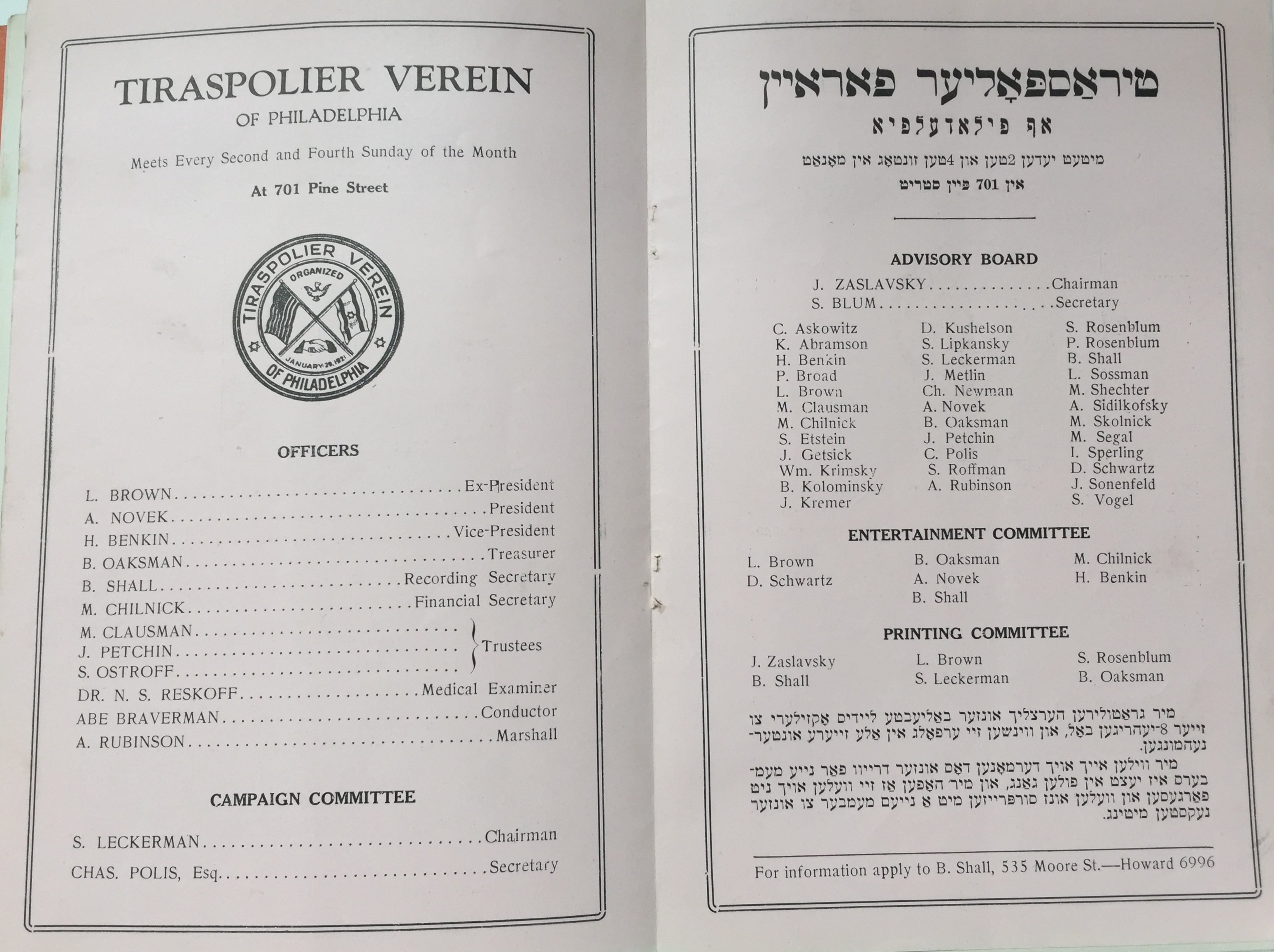 | | Tiraspolier Verein of PhiladelphiaOfficers, Campaign Committee, Advisory Board, Entertainment Committee, Printing Committee