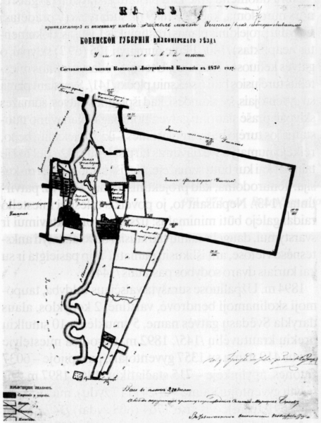 Prepared by a Russian (government) surveyor by the name of Andrejev, and part of a much larger survey. The map/plot plan has to be viewed in the historical context of the 1863 uprising against the central government. As punishment for the revolt, a significant portion of the populace around Užpaliai was exiled to Siberia and, organized by the Russian government, Russian colonists were brought in to the area to replace them - about 111 families in all. A period map of where the Russian colonists were actually settled does not show any settlers within what were Jewish owned lots. To service the new arrivals, the government drew up plans for and later [1872] built the local Russian Orthodox Church and redistributed land in the general area of Užpaliai. As part of the 1870 survey, the "outsider's" holdings in and around the town were documented. The Jewish cemetery is visible at the bottom of the plan.