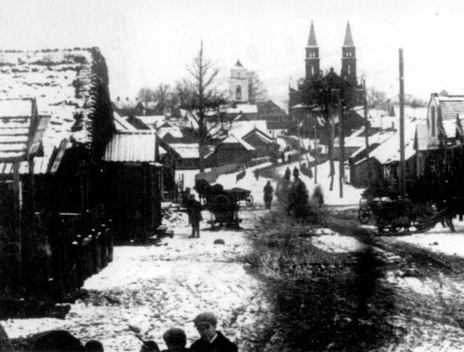 "Užtiltė" translates as a place name "beyond [už] the bridge [tiltė]" - taken from the intersection of Astiko St. (formerly Bridge St.) and K.Pakšto St. looking towards the town square. The sleigh in the right foreground is hitched up in front of what we know as the Fisher store.