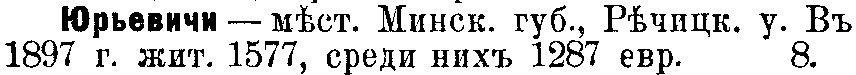 This 16-volume Jewish Encyclopedia in Russian was published in St. Petersburg by Brockhaus and Efron between 1906 and 1913. The section (Раздел) number at the end of the article specifies the article's author. For this Yurevichi article, the section 8 editor was Юлий Исидорович Гессен (Julius Isidorovich Hesse).