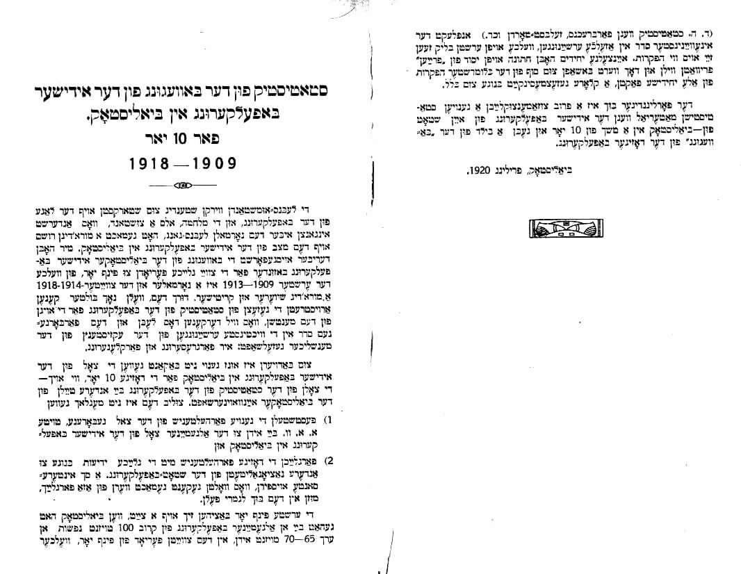 This book is a very rare statistical book about the Jewish population in Bialystok from 1909 to 1918, when many ancestors of BIALYGenners lived in the city. During this period, the majority of the city was Jewish. In 1921, there were 39,602 Jews living in Bialystok. This period is also of interest in that it covers the period before World War I, the War period and the German occupation, and the period of the Russian Revolution.