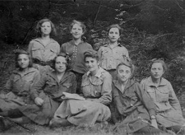 | Girls Youth Group Sitting (r. to l.): Rochele Fuchs, Basha Kratter, Channa ? Standing: Sima(?) Redlich, Chinke Kreiser, Perl Schuster |