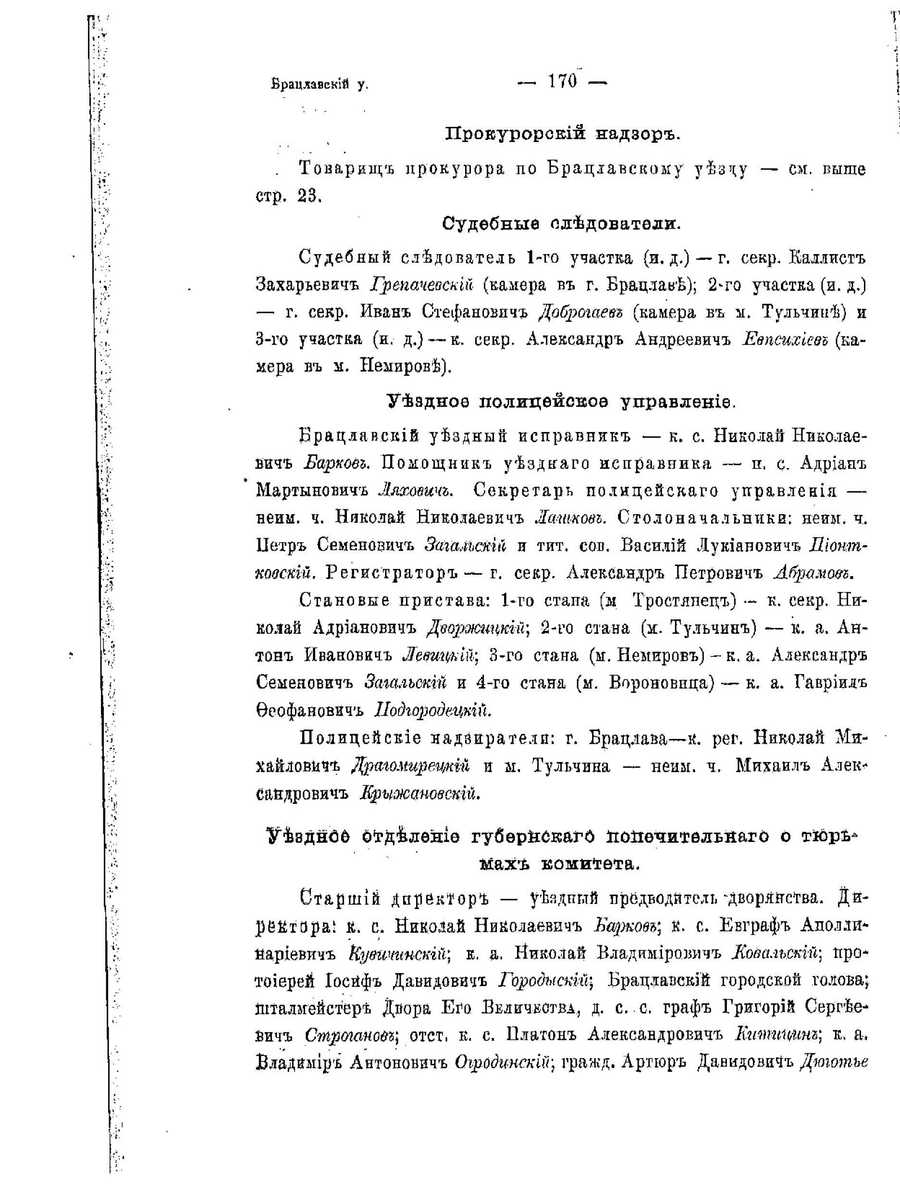 Text on the Chechelnik Books DatabaseCyrillic text: Врацлавския у. — 170 — Прокурорский надзор. . Товарищ провурора по Брацлавскому уезду — см, выше стр. 23. Судфбные оледоватфли. Судебяый следователь 1-го участка (и. д.) — г. секр. Каллист Захарьевич ГрепачевскЫ (вамера в г. Брацлаве); 2-го участва (и. д.) — г. секр. Иван Стефановпч Доброхаев (камера в м. Тульчине) и 3-го участка (и. д.) — к. секр. Александр Андреевич Евпсихиев (камера в м. Немирове). Уездноф полицфйскоф управлфниф. Брацлавекий уездный исправник — к. с. Николай Николаевич Барков. Помощник уезднаго нсправника — н, С- Адриан Мартынович Ляхович. Секретарь полнцейскаго управления — неим, ч. Николай Николаевич Лашков. Столонача.иъники: неим. ч. Петр Семенович Заиалъский и тит. сов. Василий Лукианович Пионтковсхий. Регистратор — г. секр. Алевсандр Петрович Абрамов. Становые пристава: 1-го стапа (м Тростянец) — к. секр. Николай Адрианович Дворжгщкий; 2-го стана (м, Тульчин) — к. а. Антон Иванович Лешцкий; 3-го стана (м. Немиров) — к. а. Александр Семенович ЗагалъскШ и 4-го стана (м. Вороновица) — к. а. Гавриид Феофанович"ь Подгородецкий. Полицейские надзиратели: г. Брацлава—к. рег. Николай Мйхайлович ДрагомцрецкЫ и ы. Тульчина — неим. ч. Михаил Алексаадрович КрыжановекЫ, УезднОф отделфниф губфрнекагб лопфчитфлънаго о тиюр» Мах комитфта. Старший ДпрекТоре — уездный предводйтель -дворЯнсТва. ДйревтОра! к. с. Николай Николаевич Барков; К. с. Евграф АполлиЯариевич КувичгинскЫ; к. а. Никодай Вдадимирович Ковалъскгй; протоиерей Иоеиф Давидович Городыский; Брацлавский городской голова; пгтадмейстер Двора Его ВЕЛИЧЕСТВА, Д. С. С. граф Григорий Сергеевич Стротнов; отст. к. с. Платон Адександрович Иштгщин; в. а. ВлаДймир Антонович Оиродинский; гражд. Артюр Давидович Дюютъе | Translated text: vratslavskiya y. - 170 -