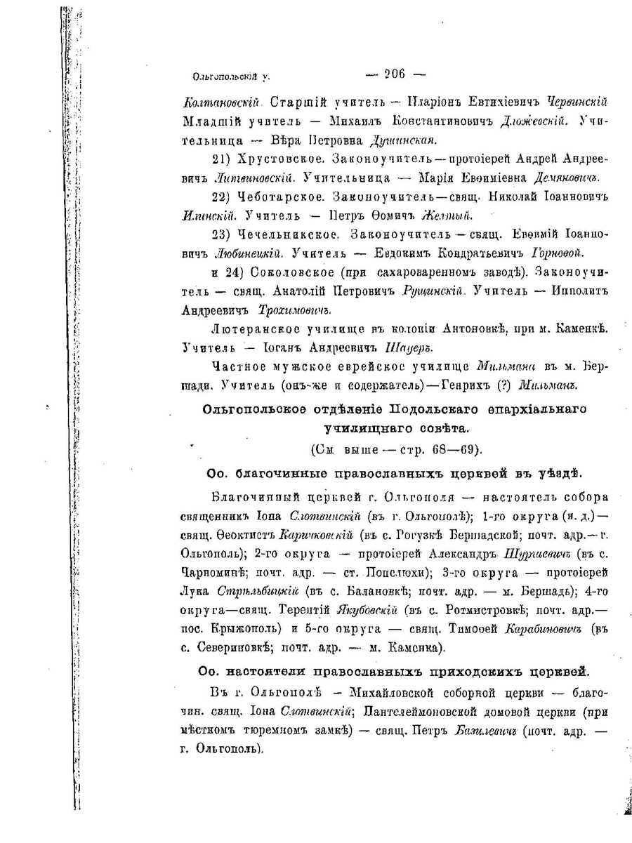 Text on the Chechelnik Books DatabaseCyrillic text: Олылиольский у. — 206 — Ео.гтановский Старший учптель — Шарион Евтнхиевич Червгснский Младший учпте.ть — Михаил Ковстантинович Дложевский. Учптедьнпца — Вера Петровна Дугишнская. 21) Хрустовское. Законоучитель — протоиерей Андреии Андреевичь Литвиновскиис. Учительница —• Мария Евфимиевна Демяновгсч. 22) Чеботарское. Законоучитель — свящ. Николай Иоаннович Илинский. Учитель — Петр Фоыич Желтый. 23) Чечельникское. Законоучитель —- свящ. Евфпмий Иоаннович Любинещий. Учитель — Евдоким Кондратьевич Горновой. и 24) Соколовское (при сахароваренном заводе). Законоучитель — свящ. Анато.иий Петрович Рущгинскиии. Учитель — Инполит Андреевич Трохимовгич. Лютеранское учи.иище в колонии Антоновке, при м. Каменке. Учитель — Иоган Андреевич Шауерг. Частное мужское еврейское училище Мгильмана в м. Бертади. Уиитель (он-же и содержатель) — Генрих (?) Милъман. Ольгопольскоф отделфниф Подольскаго фпархиалънаго ун:илипинаго совета. (См выше •—стр. 68—69). Оо. благочинные православных нфрнвфй в уеэде. Благочинпый церивей г. О.тьгополя — настоятель собора священнив Иопа С.югпвинский (в г. Ольгополе); 1-го округа(и. д.) — свящ. Феоктист Еаргсчковский (в с. Рогузке Бершадской; почт. адр,—г. Ольгополь); 2-го округа — протоисрей Александр Шгургаевич (в с. Чарномине; почт. адр. — ст. .Попе.июхи); 3-го округа — протоиерей Лука Стрелъбгщкиис (в с. Балановке; почт. адр. — м. Бершадь); 4-го округа—свящ. Терептий Якубовский (в с. Ротмистровке; почт. адр.— пос. Крыжополь) и 5-го округа — свящ. Тнмофей Еарабгиновгсч (в с. Севериновке; почт. адр. — м. Каменка). Оо. настоятфли православных приходских цфрквфй. В г. Ольгополе — Михайловской соборной церкви — благочин. свящ. Иона С.тпвинскгщ Пантелеймоновской домовой церкви (при местном тюремном замке) — свящ. Петр Базилевич (почт. адр. — г. Ольгополь). | Translated text: Olyliolsky y. - 206 -