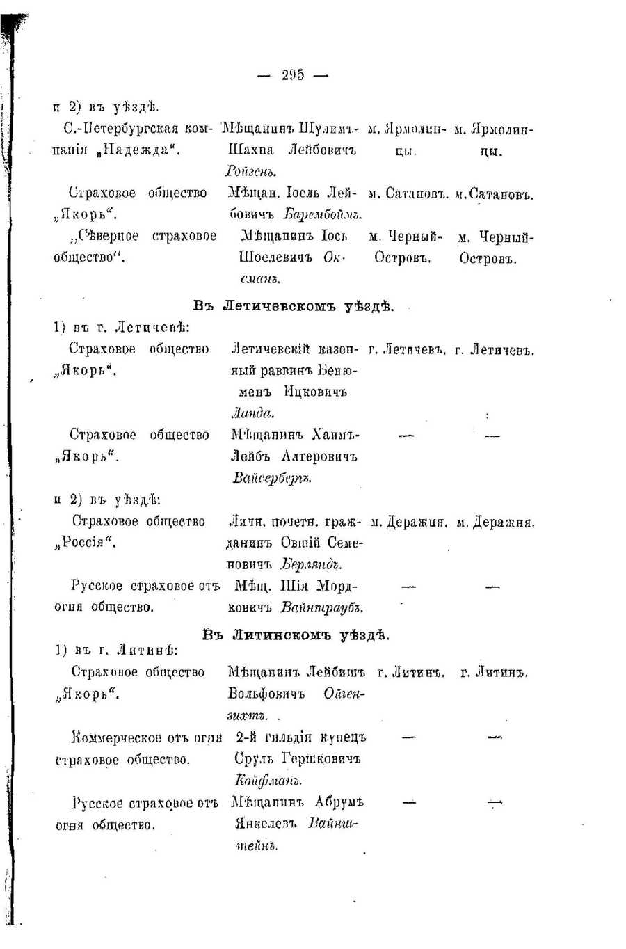 Text on the Chechelnik Books DatabaseCyrillic text: п 2) в уезде. С.-Петербургская ком- Мещанин Шу.тпмт,- м. Ярлолин- м. Ярмолинпапия „Надежда". Шахна Лейбович цы. Ройзсн. Страховое общество Мещан. Иоель Лей- м. Сатанов. м.Сатанов. „Якорь". бович Еарембойм. „Северное страховое Мещапин Иось м. Черний- м. Черныйобщество". ИЛоедевич Ок- Остров. Остров. сманг. В Лфтичевском уезде. Г) в г. Летпчеве: Страховое общество Летичевский казен- г. Летпчев, г. Летичев. ^Якорь". ный раввин Бентомеп Ицкович Ланда. >. Страховпе общество Мещанин Хаим- — — „Якорь". Лейб Ллтерович ВаЫерберг. и 2) в уезде: Страховое общество Личя. почетн. граж- м. Деражня. м. Деражня, яРоссия". данин Овгаий Семенович Берлянд. Русское страховое от Мещ. ИИИия Морд- — — огня общество. кович Вайнтрауб. В Литинском уезде, 1) в г. Лптине: Страховое общество Мещанин Лейбвш г. Литин. г. Литин, „Якорь". Больфович Ойиензихт. . Коммерческое от огий 2-й гпльдип купец — —-> СТраховое общеетво. Сру.ть Герипкович Еойфман. Русское страховое от Мещаппн Абрум — -^* огня общество. Янкелев Вайниитейн. | Translated text: n 2) in the county.