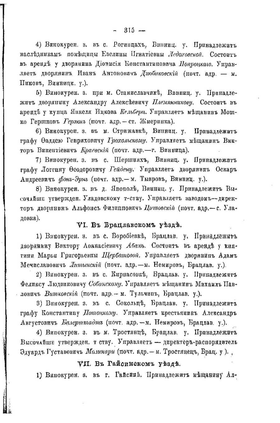 Cyrillic text: 315 — 4) Винокурен. з. в с. Рогинцах, Випниц. у. Прпнадлежит наеледникам помещицы Евелины ИИгнатиевны Лсдоховскоии, Состоит в аренде у дворянина Дионисия Константиповича Лощюцкаго. Унравляет дворянин Иван Антонович Дзюбиковский (почт. а.др. — м. Пиков, Винницк. у.). 5) Винокурен. з. при м. Станнславчике, Випниц. у. Пртшадлежит дворяпнну Александру Алексеевичу Ллемянникову. Состоит в аренде у купца Янкеля Ицкова Ее.гьбера. Управляет ыещанин Мощко Гершков Герзюк (почт. адр.—ст. Жмеринка). 6) Винокурен. з. в м. Стрижавке, Винниц. у. Принадлежит графу Фаддею Генриховичу Грохольскому. Управляет мещанин Виктор Викентиевич Ераевский (почт. адр.—г. Винница). 7) Винокурен. з. в с. Шершнях, Винниц. у. Принадлежит графу Логгину Феодоровичу Гейдену. Управляет дворяяин Оскар Андреевич фон-Эрн (почт. адр.—м. Тывров, Винниц. у.). 8) Винокурен. з. в д. Янополе, Винниц. у. Принадлежит ВыООЧАЙШЕ утвержден. Уладовскому т-ству. Управляет ааводомъ—директор дворянин Альфоне Филиппович Цитовский (ночт. адр.—с. Уладовка). VI. Б Врацлавоком уезде. 1) Виаовурев. а. в с. Воробиевке, Врацлав. у. Принадмежнг ДворяНвну Виктору Аоанасиевпчу Абазе. Состоит в ареНде у княгини Марьп Григорьевпы ИЦербатовой. Управляет дворянин Адам Мечиславович Литынский (почт. адр.—ы. Немиров, Брацлав. у.). 2) Винокурен. з. в с. Кириасовке, Врацлав. у. Брпнадлежит Феликсу Людвиковичу Собанскому. Управляет ыещанин Михаил Павдовпч Витковский (почт. адр.~ м. Тульчин, Брацлав. у.). 3) Впнокурен. з. в с. Сокольце, Брацлав. у. Принадлежит графу Константину Лотоцкому. Управляет крестьянин Александр Августович Лалерттадпи (почт. адр.—м. Немиров, Брацлав. у.). 4) Винокурен. з. в м. Тростянце, Брацлав. у. Принадлежит ВЫСОЧАЙШЕ утвержден. т ству. Управляет — директор-распорядитель Эдуард Густавович Молинари (почт. адр, —м. Тростянец, Брац. у ). , VII. В Гайоинском уезде. 1) Винокурен. з, ь г. Гайсйне, Принадлежит мещанйну" Ал- | Translated text: 315 -