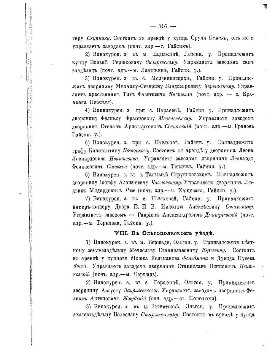 Cyrillic text: 316 — теру Скупнику. Состоит в аренде у купца Сруля Османа, он-же и управляет заводом (почт. адр,—г, Гайсин). 2) Винокурен. з. в м. Ладыжине, Гайсин. у. Принад.тежит купцу Вольке Гершковичу Ск.гяревскому. Управляет заводом еам владелец (почт. адр. —м. Ладыжин, Гайспн. у.). 3) Винокурен, з. в с. Мельниковцах, Гайсин. у. Припадлежит дворяннну Михаилу-Северину Владпмировичу Червинскому. Управляет крестьянин Тит Фавстович Еасгггелли (почт, адр. — с. Крапивна Нижняя). 4) Виннокурен. з. прп с. Нараевке, Гайсин. у. Прпнад.теж.ит дворянину Феликсу Францовичу Меленевскому. Управляет заводпм дворяпин Степан Аристарховпч Сосновский (почт. адр.—м. Граноа Гайсин. у.). 5) Винокурен. з. при с. ПчелыиоЯ, Гайсин. у. Принадлежпт графу Константипу Логпоги/кому. Состоит в арепде у дворлнина Леона Леонардовича Лваиикевича. Управллет заводом дворянпн Леонардъ^ Феликсович Сакович (почт. адр.—м. Теплик, Гаиеия. у.). 6) Впнокурен. з, в с. Ташлике Струныиовском. Прпнад.теншт дворянину Иосифу Алоизиевичу Чахновскому. Управляет дворянин Л"юдвпк Мидордович Розе. (почт, адр.—м. Хащевата, Гайсян. у.). 7) Впнокуреп. з. в с, Шляховой, Гаитсин. у. Прпнадлежнт камер-юнкеру Двора Е, И, В. Николаю Алексеевичу Столыпину. Управляет заводом — Гавриил Александровпч ДмигпрИРвский (почт. адр,—м. Терновка, Гайснн. у.). ИШ. В Ольгопольоком уезде. 1) Винокурбн. з. в м. Бершади, Ольгоп. у. Принадлежит местному землевладельцу Мечиславу Стапиславовичу Юрьевгичу. Состопт в аренде у купцов Мошка Кельманова Фельдмана и Дувида Нусева Фиха. Згправляет заводом дворянин Станислав Осипович Центковскгй (почт. адр,—м. Бершадь). 2) Впнокурен. з, в с. Городище, Ольгоп. у. Прттаддежпт дворянину Августу Закржевстму. Управляет заводом дпорянин Феликс Антонович Жмудский (поч. адр, —ст. Попелюхп), 3) Винокурен. з. в м, Загниткове, Оли.иоп. у. Прпнадлежит ремлевладедьпу Болеславу Старжиискому. Состоит в арепде у купца | Translated text: 316 -