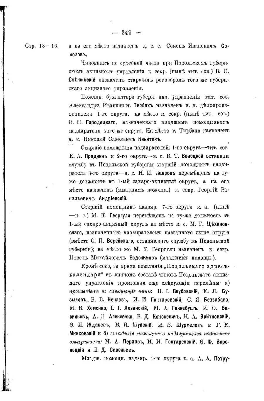Cyrillic text: — 349 — Стр. 13—16. а иа ето место назначен д. с. с. Семен Иванович Соколов. Чиновннк по судебной части при Подольском губернском акцизном управлении к. секр. (ныне тит. сов.) В. 0. Снежинсний наэначен старшим реишчором того же губернскаго акцизнаго управления. Полощн. бухгалтера губерн. акц. управления тит. сов. Александр Иванович Тирбах назначен и. д. делопроизводителя 1-го округа, на место к. секр. (ныне тит. сов.) В. Н. Городецкаго, назначеннаго младшим помощником надзирателя того-же округа. На место г. Тирбаха назначен н. ч. Николай Савельич Нинитин. Старшие иомощники надзиратедей: 1-го округа—тит. сов Е. А. Прядкин н 2-го округа—н. с. В. Т. Волоцкой оставили службу в Подольской губернии; старший лонощник надзиратель 3-го округа—н. с. Н. И. Лавров перемещен на тужф должность в 1-ый сахаро-акцизный округ, а на его место назначен (младшим ломощн.) к. секр, Георгий Васильевич Андриевский, Старший помощник надзир. 7-го округа к. а. (ныне •—н. с.) М. К, Георгули перемещен на ту-же должность в 1-ый сахаро-акцжзный округ на место к. с. М. Г. Цехановскаго, назначеннаго надаирателеы названнаго выше округа (вместо С. П. Верейснаго, оставившаио службу в Подольской губернии); на место же М. К, Георгули назначен к. секр. Павел Михайлович Евдокимов (младшим помопгн.). Кроме сего, за время печатания „Подольскаго адресъкалендаря" в ллчном составе чинов Подольскаго акцизнаго управдения произошди еще сдедующия перемены: а) щитзведени в следующие чииы: В. I. Якубовский, К. Я. Бузылов,. В. В. Нечаев, И. И. Гоптаревский, С. Я. Беззабава, М. В. Хоменко, I. I. Лозинский, М. А. Ганнебуш, И. Ф. Васильев, А. Д. Алексенко, В. Д. Коносевич, Н. А. Войтновсний, Ф. И. Жданов, В. И. Шуйский, И. В. Шурмелев и Г. К. Мниховский и б) младгиге помощнгти надзирателей назначены старшими: М. А. Перцов, И. И. Гоптаревский, Ф. Ф. Воронецкий и Л. Д. Савельев. Младш. номощн. надзир. 4-го округа к. а. А. А. Петру- | Translated text: - 349 -