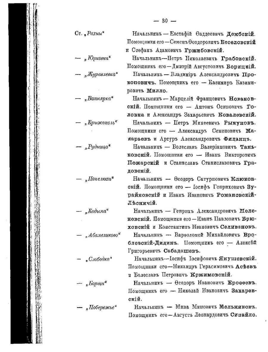 Text on the Chechelnik Books DatabaseCyrillic text: — 30 — Ст. „Рахны* — „Юрковка" — „Журавлевка" — „Вапнярка" — „Крыжополь" — „Рудтща" — „Попелюхи" — „Кодыма" — „Абамеликово" — „Слободка" — „Боргци" — „Побережье" Начальник — Евстафий Фаддеевич Дфмбовий. Поыощники его—СеменъФеодорович Вфселовский и Стефан Адамович Грэкибовский. Начальникъ—Петр Николаевич Грабовсвий. Помощник его —Дмитрии Августович Борицкий. Начальник — Владимир Александрович Провопович. Помощник его — Казимир Казимирович Милло. Начальник Марцелий Францович Новавовсвий. Помощники его — Антон Осипович Головва и Александр Захарьевич Ковалфвсвий. Начальник — Петр Михеевич Рыкунов. Поыощники его — Александр Семенович Маварьев и Артур Александрович Фяданц. Начальник — Болеслав Валерианович Таньковский. Помощниви его — Иван Викторович Поэкарский и Станислав Станиелавович ГраДОВСЕИЙ. Начальник — Феодор Сатурнович Клюковский. Поыощники его — Иосиф Генрихович Зурайковсвии и Иван Иванович РомановскийЛесничий. Начальник — Генрих Александрович Мфленфвский. Помощниви его—Иван Павлович Брюховский и Коястантин Иванович Селиванов. Начальник — Варфоломей Михайлович Вррблфвекий-Дидик. Помощник его — Алевсвй Григорьевич Сабадашфв. Начальникъ—Иосиф Иосифович Янушевский. Поыощники его—Никандр Герасимович Асефв и Болеслав Петрович Крисимовсвий. Начальник — Феодор Иванович Ерофффв. Помопшик его — Николай Иванович Захарфвсиии. Начальник — Мина Мииович Мфльников. Поыощнив его—Август Леонардович Сипайло. | Translated text: - 30 -