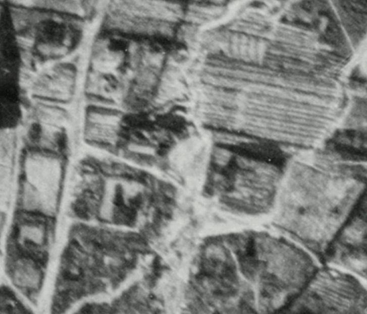 In order to place this building on the 1945 aerial, one can align the aerial with a modern map at openstreetmaps.org, and adjust the items in a graphics program until they correspond. Top of the map and photo is towards northeast.