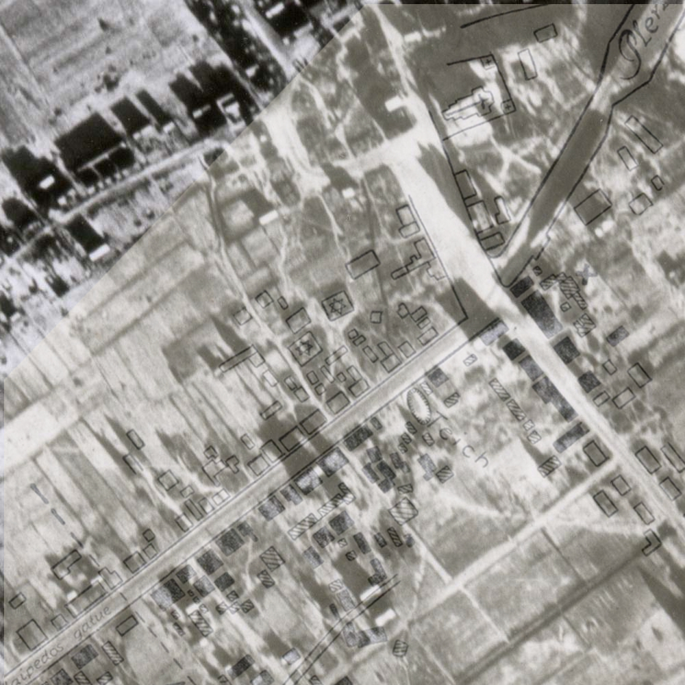 A 1940 version of 1:25,000 map #0294 Laugallen, shown at Deutsche Fotothek, has a very detailed view of Gorschdy. The Russian side of the border on this map is stated to based on an 1895 Russian map, scaled at 1:42,000. The map has the symbol for a wooden synagogue within Gorschdy. Comparison (.gif alternating at 6 second intervals) shows a very close alignment with the southwestern of the two buildings marked with a Jewish star on the firemap. The base of the circle component of the synagogue symbol aligns with the location of the wooden synagogue as shown on the aerial photograph:
