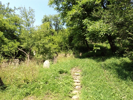 | When approaching the village, you can clearly see tombstones high on the mountainside. Access to the cemetery is along the highway, behind a private home. Burials occurred, literally, on a very, very steep mountainside. |