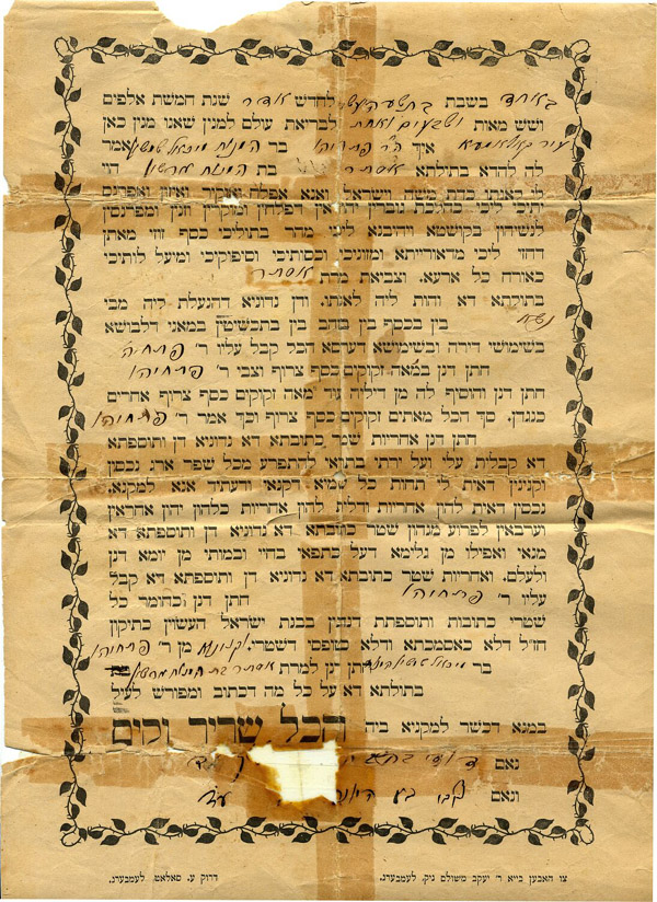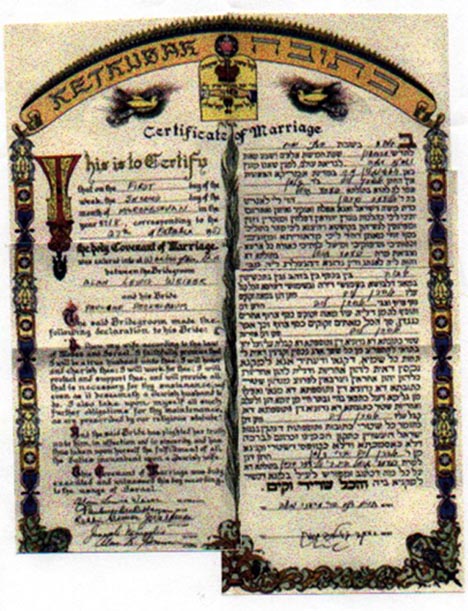 An English translation provided by Rabbi Gedalyah Jeremias of the 1911 Ketubah can be read and compared with the 1957 Ketubah. The 1957 Ketubah is printed with Aramaic on the right side and English on the left side; thus, the groom had no excuse for denying his knowledge of the obligations he was signing up for. It is interesting to note that in the two versions of the Ketubahs there nothing that stipulates that the wife must adopt the husband’s surname. The Ketubah is a one-sided contract obligating the husband to the wife.