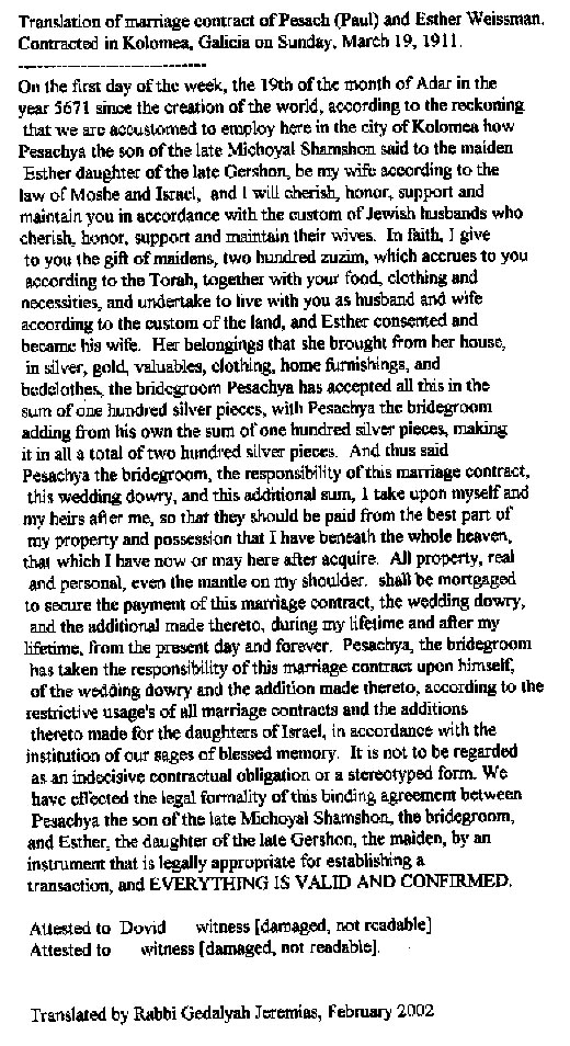 It appears that the Ketubah, the marriage contract given by the groom to his bride at a Jewish wedding maybe one of the earliest documents showing the names of the groom and bride together. The Ketubah defines the extent of a husband’s obligation towards his wife and may include obligations for clothing, conjugal rights, price to be paid to the bride’s father, the bride and groom’s dower contribution, how the bride would be taken care of in case the husband dies or divorce. For comparisons of the legal form, content, and appearance of Ketubahs, a 1911 Ketubah furnished by KRG member Michael Weissman from his Kolomea grandparents and a 1957 Ketubah from the KRG Coordinator are provided.