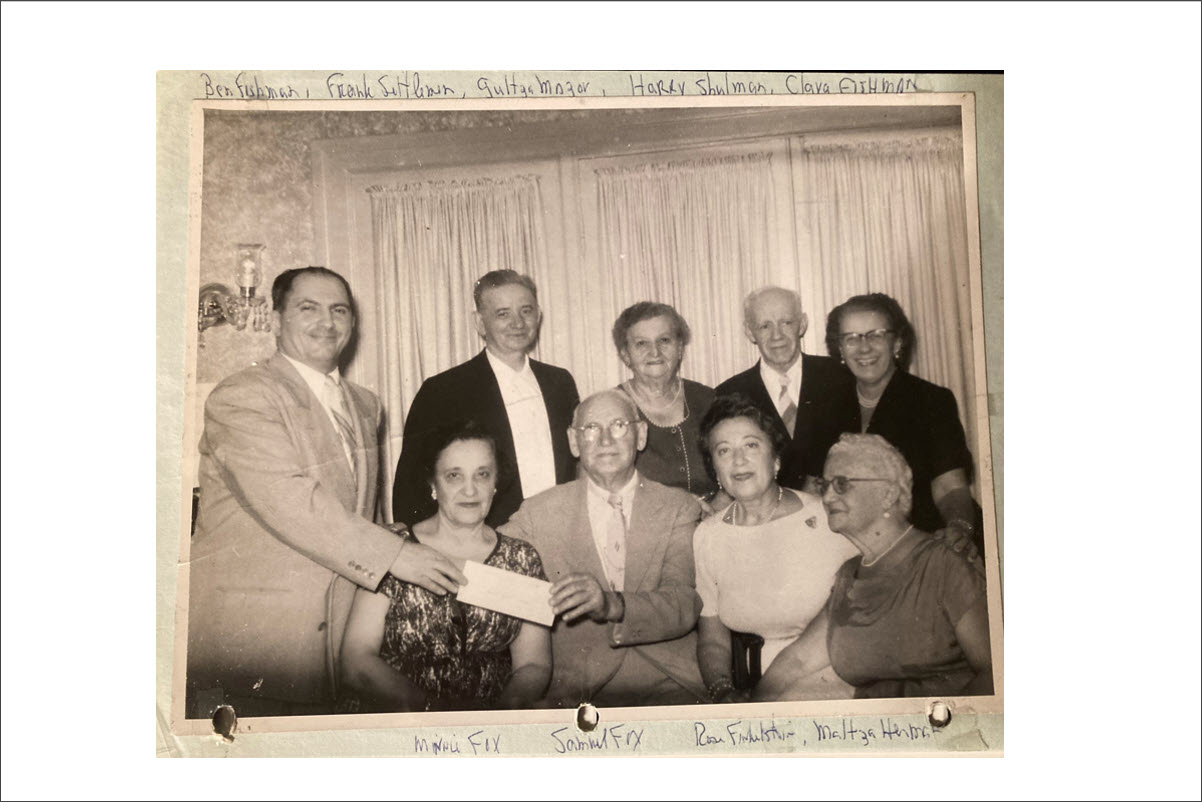 In 1953-1955, Mlynov and Mervits born individuals and their children in the US raised money to support the creation of a memorial plaque in Tel Aviv. Records kept in the Fishman family in Baltimore record the names of the donors in America who supported the plaque's creation. Most were either born in Mlynov or Mervits, or were first generation children of immigrants from those towns. As captured in two photos, some of the Mlynov and Mervits-born individuals and survivors from the US and Israel gathered in Tel Aviv in the fall of 1955 at a commemoration ceremony where the plaque was installed. The story of the commemortion plaque, photos and records of the donors can be downloaded here.