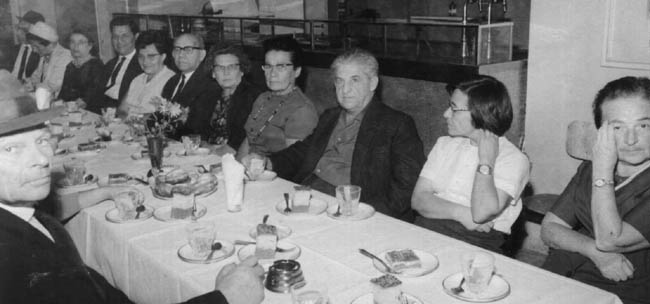 Sitting at the table from right to left: Bilha Eroni, Yitzchak Zur, unknown, Avraham Rabinowitch,