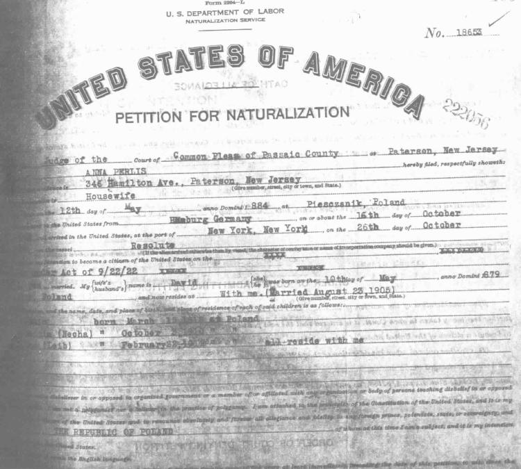 Chana PERLIS US Naturalization Born in Piesczanik Click for larger image |