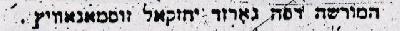 And in the Women's Gallery by the young women, Miriam and Hinda Zusmanovitz: the rebbitzen -15 kopeks; Elka Devora Zusmanovitz, Chaya Michelovitz, Chaya Hinda Zilberg, Tema Zusmanovitz, Leah Hellig - 50 kopeks each; Chana Rela Zusmanovitz -40 kopeks; Liba Zusmanovitz-30 kopeks; Chana Zusmanovitz, Sarah Beila Wolfowitz -25 kopeks each; Chana Zusmanovitz, Gitta Shalman-20 kopeks each; Gitta Mann, Miriam Zusmanovitz, Hinda Zusmanovitz-18 kopeks each; Sarah Leah Zusmanovitz, Shoshana Miriam Yaffe-15 kopeks each; Rivka Hellig, Liba Elka Shtoch, Waller, F. Folkovsky -10 kopeks each. Total: 6.30 rubles. **1/504 For the nuptials of of the young lady Sarah Beila Grikst with her groom***David Wolfowitz, they contributed: the groom-54 kopeks; the bride-50 kopeks; Baruch Netanel Yaffe, Gittel Mann, Hena Broide, Batya Ligum-25 kopeks each; Isaac Leib Luria -20 kopeks for the settlement of the land of Israel; Mordecai Reuven Luria, Samuel Hilkovitz, Zalman Tzion, Elya Fil, S.Z. Fil, Bracha Yaffe, Elya David Yankelovitz, Chaya Folkovsky, Danya Marcus, Nechama Tzik, Hada Folk, Pinchas Reznik from Tavrig -20 kopeks each; the father of the groom, Menachem Flaks, Jacob Glik, Arye Grikst, Zelig Yankelovitz, A.M. Mann, the brother of the groom A.M., Benjamin Uriash, Joseph Patz, Chaim Israelovitz, Baruch Birk, Zev son of Yechiel, Zvi Patz, Hinda Zusmanovitz, Dina Birk, Yocha Uriash -18 kopeks each; Samuel Lipmanovitz, Sima Shayevitz, Esther Folk, Shayna Markovitz -15 kopeks each; Zev son of Moshe-10 kopeks. Total: 4.65 rubles for the benefit of the yishuv (Jewish community in the land of Israel).**2/504 For the wedding of David Hellig with his bride Leah Shalman from here I collected **25/851: the groom-2 rubles, the bride and the father of the bride H.A. Shalman - 1 ruble each; Chaim Osherovitz, Mordecai Shalman from Libau, David Ackerman, David Davidov from Salant, Moshe Hellig, Arye Hellig-50 kopeks each; Zev Shimon Shtoch, Dov Hakohen Boruchov, Saul Zusmanovitz, Shraga Yavshitz, Meidenbaum, Hinda Shalman, the mother of the groom Rosa Hellig, and the undersigned -36 kopeks each; Baruch Yaffe, the rebbitzen Fruma Shapira, Tema Zusmanovitz, Rosa Traub from Avshan, Hinda Zusmanovitz, Rachel Orlansky, Chana Zusmanovitz -20 kopeks each; Jacob Glik, Menachem Shimkin, S. Aaronsohn from Telz, Yechiel Zusmanovitz, Rivka Hellig, Yeshaya Zusmanovitz, Shayna Hellig, Alta Boruchov, Chana Yaffe, Rosa Yudkovitz, Minna Zusmanovitz, Z.A. Schauss, Shayevitz, Shatnik, M. Zusmanovitz, Shachne Ackerman -18 kopeks each.(something in Russian characters) **399/24,25 For the wedding of A.M. Glatt from Neistadt with his bride Hena Broide from here, there was collected by his daughter Miriam and the young lady Rachel Wiener 4 rubles**3/504 for the settlement of the land of Israel, also 4 rubles for the National Fund and these are the donors: the groom, the father of the groom, Moshe Aaron Itzkovitz also 36 kopeks for the community(?), David Hellig with his wife -50 kopeks each; the brother of the groom David Leib - 1 ruble, half for the settlement of the land of Israel and half for the National Fund, the bride, the brother of the bride Moshe, Chana Yaffe, Mrs. Itzkovitz, Dov Glatt - 25 kopeks each; Zusmanovitz, Zussel Ackerman, his brother Elya, Dr. Zaks, Rosa Traub from Avshan, Shavel Broide, Provizor Aron, Mineman-20 kopeks each; Leah Hellig, Miriam Zusmanovitz- 18 kopeks each; Olga Berelovitz, Rachel Wiener- 15 kopeks each; Anna Ackerman, Mrs. Glatt, Rivka Glatt, Etta Shlomovitz, Mrs. Glatt, Ita Hirshovitz, Devora Friedman, Pessa Glatt, Shayevitz, Balkind, Glaun, Bernstein, Zaks, Batya Broide, Gitta Ackerman-10 kopeks each. For the wedding of Jacob Yafshitz from Loikeve with his bride Bracha Yaffe from here, they contributed: the groom-50 kopeks, the father of the bride-1 ruble; the father of the groom, the mother of the bride, the brother of the groom Shraga, the brothers of the bride Netanel and Moshe-50 kopeks each; Yechezkel Yavshitz, Isaac Zaks, Chaim Ezrielovitz, A.M. Mann-18 kopeks each; by his daughter Miriam and the young lady Sarah Shmulovitz from the women 2.28 rubles. I received in total 7 rubles**4/504 Netanel Yaffe when he blessed the bride Chaya Krosa Osherovitz and her groom Elya Kaplan contributed 50 kopeks **21/85 Netanel Yaffe when he blessed the groom Zvi Patz on his marriage to his bride Shoshana Osherovitz contributed 50 kopeks **20/851 With blessings of Zion I bless Jacob Yehuda Shlez and his wife Gitta on the marriage of their daughter with her groom Shimon Shlez, which took place in Pikelen and in commemoration I contributed 50 kopeks**22/851 ----------Yechezkel Zusmanovitz and his wife Tema Moshe Friedman when he came to visit his mother Nechama and was called up for Maftir (concluding portion of Torah reading in the synagogue) contributed 50 kopeks**23/851 When Samuel David Zilberg of Milzine brought his son into the covenant of our father Abraham and we blessed the infant who was circumcised we contributed: the father of the infant -50 kopeks; Benjamin Ackerman, Menachem Kotisker, and the undersigned -36 kopeks each; Dov Ackerman-54 kopeks, the cantor Grotiskin -18 kopeks. And I received it**24/851 Reuven Srolovitz from Shvekshne when he was called up to the Torah and blessed Asher Yaffe contributed 1 ruble - half for the settlement of the land of Israel and half for the strengthening of the faith. The same also blessed with good fortune Jacob Yavshitz and his bride Bracha Yaffe and contributed 36 kopeks for the settlement of the land of Israel. For the wedding of David Davidov from Salant with his bride Batya Ligum from here they contributed: the groom 1 ruble; Mendelovitz from Memel 50 kopeks, the brother of the groom Isaac-36 kopeks; Yechiel son of Abraham Abba -20 kopeks; Menachem Shimkin, Saul Zusmanovitz, S.Y. Regalsky, A.M. Mann, Chaim Katz, S. Wolfowitz, the father of the groom, Rabbi (?) Gedigst, Joseph Verbelov, -18 kopeks each; the undersigned-36 kopeks; by my daughter Miriam and the young 
