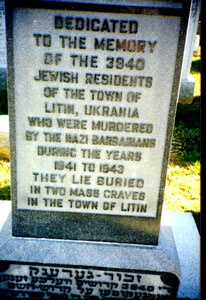 One of the first monuments dedicated to the martyrs [of the Holocaust] was erected by the Litiner Podolier Aid Organization and Ladies Auxiliary. It was dedicate in 1947 and is located at Mt. Hebron Cemetery. Several points make it a memorial of note.