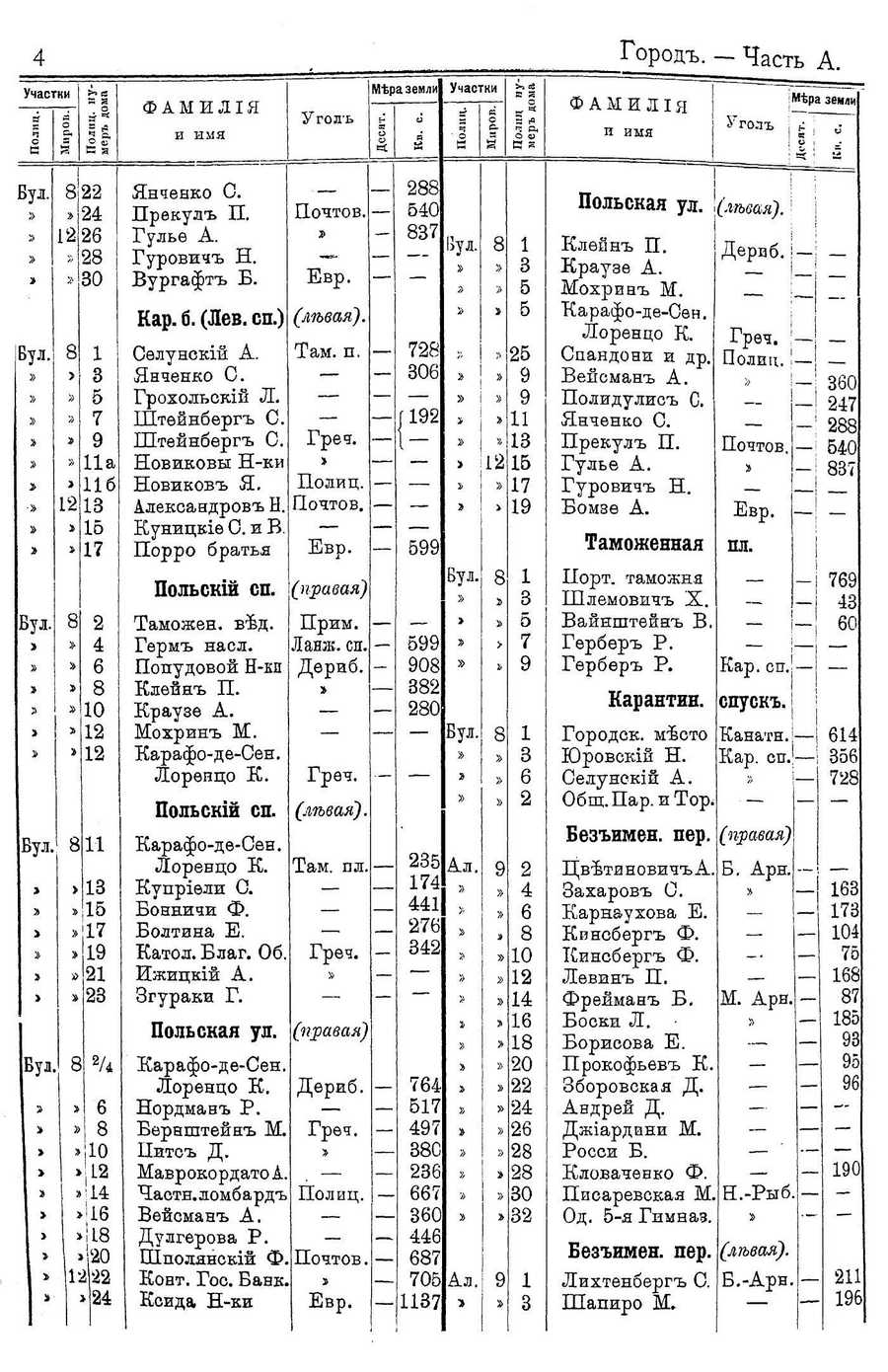 Cyrillic text: Город. - Часть А. ФАМИДИЯ и имя 121 12 22 24 26 28 30 2 4 6 8 10 12 12 Бул.1 8 11 • ИИЗ • И15 . 17 • 19 -21 »23 110 ]И2 >"и4 >!и6 >!18 »И20 1222 > 24 Янченко С. Прфкул П. Гульф А. Гурович Н. Вургафт Б. Кар. б. (Лев. сп.) Сфлунский А. Янченко С. Грохольский Л. Штфйнберг С. Штфйнбфрг С. Новжковы Н-ки Новиков Я. Александров Н. Куницкиф С. и В. Порро братья Польский сп. Таможен. въд. Герм насл. Попудовой Н-кп Клфйн П. Краузф А. Мохрин М. Карафо-де-Сен. Лорфнцо К. Польский сп. Карафо-дф-Сфн. Лоревцо К. Куприфли С. Бонничи Ф. Болтина Е. Катол. Благ. 06. Ижицкий А. Згураки Г. Польская ул. Карафо-де-Сен. Лоренцо К. Нордман Р. Бфрнштейн М. Нитс Д. Маврокордато А. Частн.ломбард" Вейсман А. Дулгерова Р ЙИподянский Ф.| Конт. Гос. Банк. Ксида Н-ки Угол Мера земли Почтов, Евр. (левая), Там. п. Греч. Полиц. ГИочтов. Евр. (правая)\ Прим. Лашк. сп. Дериб. Грфч. (левая) Там. пл Греч (правая) Дфриб. Грфч. Полиц. Почтов Евр. 288 540 837 728 306 192 599 599 908 382 280 235 174! 441 2761 342 764 517 497 38С 236 667 3601 446 687 705 1137 Вул. Ии2 Вул. Ал, Ал, Ф А М И Л I Я п имя Мера землии ^гол Польская ул. \(л?ъшя). Клфын П. Краузе А. Мохрин М. Карафо-де-Сен. Лоренцо К. Спандони и др. Вепсман А. Полидулис С. Янченко С. Прекул П. Гулье А. Гурович Н. Бомзф А. Таможенная Порт. таможня Шлемович X. Вайнштейн В. Гфрбфр Р. Гфрбер Р. Карантин. Городск. место Юровский Н. Селунский А. Общ. Пар.иТор. Безъимен. пер. ЦветнновичъА, Захаров С. Карнаухова Е. Кинсберг Ф. Кинсберг Ф. Лфвин П. Фрейман Б. Боски Л. Борисова Е. Прокофьев К. Зборовская Д. Андрей Д. Джиардини М. Росси Б. Кловач:фнко Ф. Писаревская М, Од. 5-я Гимназ. Безъимен. пер. Лихтенберг С. Шапиро М. Дервб. ! —: Грфч. ; Полиц. ! Почтов. Евр. пл. Кар. сп.|[спуск. | Канатн.1Кар. сп.|(п-равая) Б. Арн. М. Арн, Н.-Рыб, (левая). Б.-Арн. | Translated text: City. - Part A.