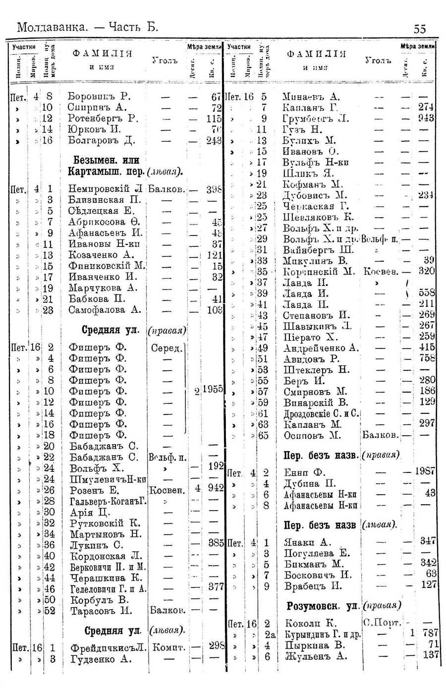 Cyrillic text: Молдаванка. — Часть Б. 55 Участки ФАМИЛИЯ Мера земли Пет. 4 8 10 12 * 14 16 Пет. 4 1 3 | •<• 5 I "• 7 И » 9 И 11 и • 13 И •• 15 и -17 I : 19 I > 21 ! 23 Пет.16 >:ю » 12 » 14 >;16 »И18 » 20 » 22 >24 >:24 .126 » 28 .30 » 32 » 34 » 36 » 40 »"42 »|44 »!46 »|о0 »52 Пет. 16 Боровпк Р. — Сппрпн А. — Ротенберг Р. — Юрков II. — Болгаров Д. — Безымен. или Картамыш. пер.(лшял). Немировскш Л Балков. Близннская П. — Седлецкая Е. — Абрпкосова Ф. ! — Афанасьев И. | — Ивановы Н-ки I — Козаченко А. и — Фпниковский М.и — Иванченко И. ~ Марчукова А. и — ! Бабкова П. | — и Самофалова А. Средняя ул. и Фишер Ф. | Фишер Ф. и Фишер Ф. и Фишер Ф. и Фишер Ф. и Фишер Ф. И Фишер Ф. ! Фпшер Ф. | Фишер Ф. И Бабадлсан С. I Бабаджан С. Вольф X. ШмулевйчъН-ки Розен Е. Гальвер-ЕоганъГ. Ария Ц. Рутковскии К. Мартынов Н. Лукпн С. Кордонская Л. Берковичи П. п М. Черашкина К. Гелеловпчи Г. п А. Корбул В. Тарасов И. 67 72 115 7(г 243 39^ 45 4Ь 37 121 15 32 41 103 (нраоая) Серед. Средняя ул. ФрфйдпчкисъЛ. Гудзенко А. 9 1955 В^льф. п. и и — > Ги 192 Косвен. I 4; 942 385 и-и 377 Балков. —И (левая). : Компт -и 293 -I Участки >• л ИГет.Иб 5 : 7 9 11 13 : 15 » 17 > 19 >2и » 23 25 > 25 »И27 29 : ИЗИ »ИЗЗ И35 > 37 =>!39 »-4и ; 43 ••45 > 47 >И49 :>|51 >И53 455 >И57 »!59 461 >И63 » 65 Пет. 4; 2 4 6 8 Пет. 4 1 3 5 7 Пет.ииб \ | » » и » Ф Д М И Л I я и имя Мера зеили Угол 274 913 Мннаев А. Каплан Г. Гримбепг Л. Гуз Н. Булпх М. Иванов 0. Вильф Н-ки иПлнк Я. Кофман М. Дубовис М. Черкаская Г. — — — Шевляков К. • — — — Вольф X. и др. — — — Вольф X. и др.иВольф- п. — — Вайнберг Ш. — — Мпкулин В. Корчпнскш М Ланда II. Ланда И. Ланда II. Степанов И. Шавыкпн Л. Пиерато X. Андрейченко А. Авидон Р. Штеклер Н. Бер И. Смирнов М. Впнарскии В. Дроздовские С. иС. Каплан М. Осппов М. Коевеа. — 231 39 320 558 211 269 267 259 415 758 280 186 129 - - 297 иБалков.;Пер. без Еазв.\Оиравая) Еннп Ф. — Дубина П. Афанасьевы Н-кп | — Афанасьевы Н-КИИ Пер. без назв \(левая). Янаки А. I — Погуляева Е. и — Бикман М. — Босковпч И. | — Врабфц И. — 1987 43 1 347 Розумовск. ул. 2 Коколи К. 2 а Курындпн Г. и др. 4 ! Пыркина В. 6 | Жульен А. (праьая) О.Порт. - — — " и 1 787 - - 71 - И—! 137 | Translated text: Moldavanka. - part b.