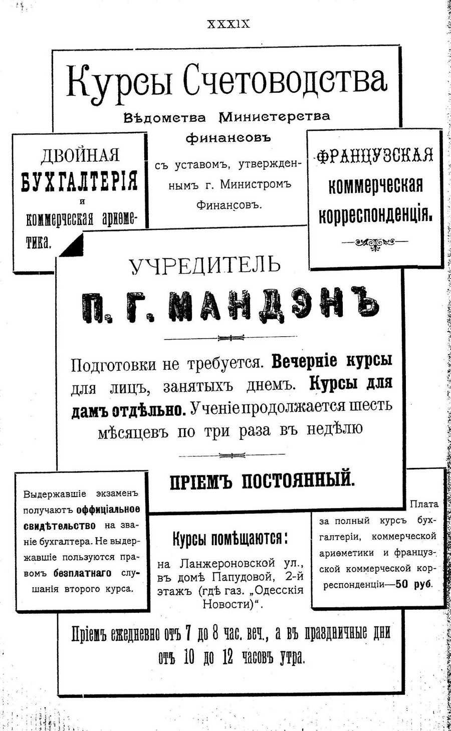 Cyrillic text: XXXIX Куроы Счетоводетва Ведометва ДОиниетеретва ДВОЙНАЯ БУ X ГАЛТЕРИЯ И коммерческая арифмефинанеов с уставом, утвержденным г. Министром Финансов. ФРАНЦУЗСКАЯ коммерчеекая корреепонденция. ша. л УЧРЕДИТЕЛЬ л УЧРЕДИТЕЛЬ и , г- 1 Подготовки не требуется. Вечерние курсы для лиц, занятых днем. Курсы для дам отдельно. Учениепродолжается шесть месяцев по три раза в неделю г ** Выдержавшие экзамен получают оффициальноф ПРИЕМ постоянныи. 1 Плата 1 СВИДеТФЛЬСТВО на звание бухгалтера. Не выдержавшие пользуются пра~ вом бфзплатнаго слушания второго курса. Курсы помещанзтся: на Ланжероновской ул., в доме Папудовой, 2-й этаж (где газ. „Одесския Новости)". за полный курс бух- ? галтерии, коммерческой $ - I арифметики и француз- ; ской коммерческой кор- | респонденции—50 руб. И 1 Приеи вжвднев ю от 7 до 8 ш.т, а в щ от 10 до 12 исов да. иазднвчные ри " "1 : • "1 •;и | Translated text: XXXIX