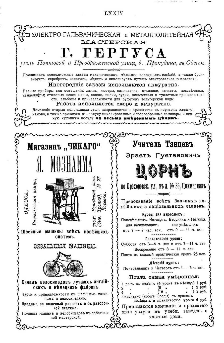 Cyrillic text: ЬХХИИ Ь|р ЗЛЕКТРО-ГАЛЬВАНИЧЕСКАЯ и МЕТАЛЛОЛИТЕЙНАЯ <^КГ 6 ^ МАСТЕРСКАЯ V Г. ГЕРГУОА угол Почтовой и Преображенскойулац, д. Прокудина, в Одессе. Принимает всевозможные заказы механических, медных, слесарных изделий, а также бронзирует, серебрит, золотит, медит и никелирует путем электрогальвано-пластики. Иногородниф заказы исполняются аккуратно. Разные приборы для освещения: лампы, люстры, паникадила, ставники, кенкеты, подсвечники, канделябры; столовыя вещи: ножи, ложки, вилки, судки, письменныя и туалетныя принадлежности, альбомы и принадлежности для буфетов зельтерской воды. Работа исполняется скоро и аккуратно. Р г-> Домашния старыя поломанныя вещи исправляются и приводятся в порядок изящно, иИи)^ наново, а также принимаю в полуду никелированные и посеребренные самовары и вся^ рсХТР кую кухонную посуду по весьма умНЬренным ценам. Магазин „ЧИКАГО" Учитель Танцев Эрает Гуетавович Швейныя машины всех новейших систем. шшныя шашны. Склад велосипедов лучших английских и немецких фабрик. Части и принадлежности к швейным машинам и велосипедам. Продажа за наличный разсчет и с разсрочкой платежа. Починка машин и велосипедов в собственной мастерской. по Пдоиоювск. ц, п и № Щ Циимещан Прфподаваниф всйх бальных новейших и национальных танцфв. Курсы для взрослыхъ: Понедельник, Четверг, Вторник и Пятница для начинающих для умеющих от 7 — 9 час. веч. от 9 — 11 ч. веч. Практические уроки: Суббота от 3—6 ч. дня и от 7—11 ч. вечВоскресение от 8 — 11 ч. веч. Плата за каждый практический урок 25 коп. Детский иурсъ: Понедельник и Четверг от 4 — 6 ч. веч. Плата самая умеренная: 1 раз в неделю (4 урока в месяц) I руб. (8 . п ) 2 руб. . , „ (16 - - ) 3 руб. ежедневно (кроме Среды) с правом посещать и практические уроки 4 руб. Принимаются компании и предлагаю свои услугя в учебн. заведфн. н частныф дома. | Translated text: HHII
