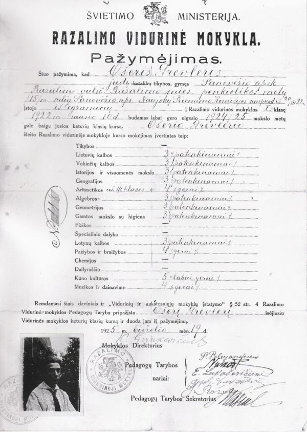 ![]() My father Asher's schoolcertificate, 1925. On top it reads: Lietuvas Respublika