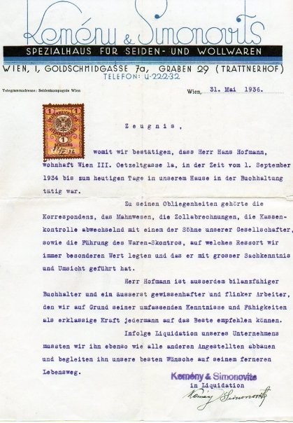 Specialty House for Silk & Woolen Goods Business Letter Vienna, 31 May 1936 (in German) (click to enlarge) |