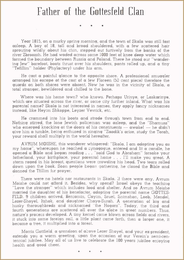 ![]() "Father of the Gottesfeld Clan" (Avraham Moshe Gottesfeld) This is the story of Avraham Moshe Gottesfeld, written by his great-grandson Morris Gottfield. Shimshon Gottesfeld, son of Avraham Moshe, married Esther Wiesenthal. Their son Avraham Moshe (1896-1897), named in memory of his grandfather, died in infancy. Their son Shraga Gottesfeld made aliyah in 1934. |