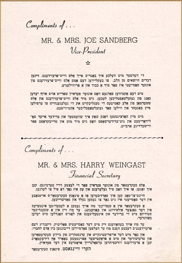 Greetings: M/M Joe Sandberg (Vice-President); M/M. Harry Weingast (Financial Secretary)