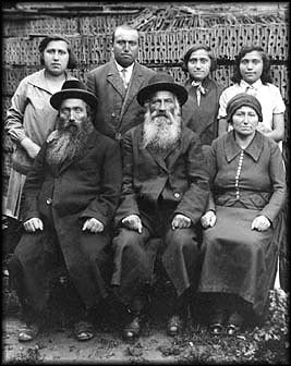 | Family of CHANA WIESENTHAL HERZOG (born 1883; daughter of Hersh Eliyah Wiesenthal and Ethel Weissman). Left to right (front row): Chana's husband, YITZCHAK HERZOG, her father HERSH ELIYAH WIESENTHAL, CHANA; (back row): the Herzog children -- FEIGA HERZOG LEVIT (born ca. 1910), TUVIYA HERZOG (born ca. 1908), LEAH HERZOG HAUSNER (born ca. 1913), RACHEL HERZOG (born ca. 1915). Hersh Eliyah died before the war. The rest of Chana's family, including Feiga's husband YAKOV LEVIT (not pictured), were murdered in Belzec in 1942. Leah's husband MECHAL HAUSNER (not pictured) survived the war as a slave laborer and made aliyah.