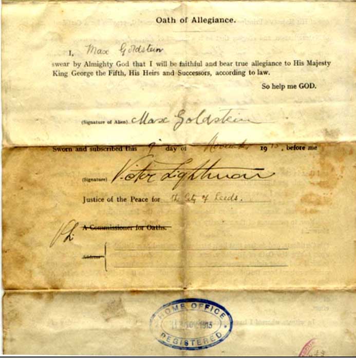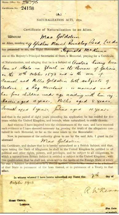 ![]() Max changed his name to Goldstein. He became a naturalized British citizen in 1913. He died in Leeds on July 12, 1929. Max and Fanny are the maternal grandparents of SRG's Alex Woodle. |