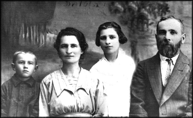 | Family of MALKA WIESENTHAL GRINOVEZER (born ca. 1889; daughter of Meier Wiesenthal and Sura Bleier). Left to right: Malka's son AVRAHAM GRINOVEZER (born ca. 1917), MALKA, her daughter LEAH GRINOVEZER (born 1909), her husband MECHAL GRINOVEZER. Leah made aliyah in the 1930s. The rest of the Grinovezers died in the Holocaust.