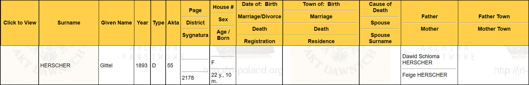 | Who has Samuel Harris? According to his British naturalization papers, he was the son of Davis and Fanny Harris; but these almost certainly were Anglicizations of the family names. In the JRI-Poland records, there is mention of a man named David Shloime Hersher, who was married to a woman named Feige. Samuel's surname Harris could be an Anglicization of Hersher and David/Feige could have become the Davis/Fanny whom Samuel [re]named as his parents in his naturalization papers. David and Feige Hersher's daughter Gittel (whose death at age 22 was recorded in 1893) would have been born around 1871, which would have made her a contemporaneous sibling of Samuel, who was born in 1873. Unfortunately, no birth record for Samuel has been found to date. |