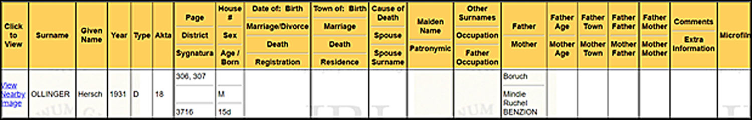 | Also of import to this family's history may be the JRI-Poland record of the death of Hersh Olinger, infant son of Baruch Olinger and Mindi Ruchel Benzion. There is a record of the marriage of a woman named Rifke Hersher, daughter of David Hersher, to Fischel Benzion. Mindi Ruchel Benzion, wife of Baruch Olinger, probably was the daughter of Rifke Hersher Olinger and Fischel Benzion. She likely was the same Mina Olinger who was Samuel Harris's niece named in his Will. This would suggest that Rifke Hersher Olinger was the sister of Samuel and Morris Harris. |