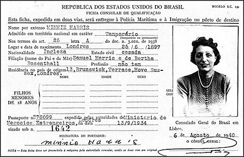 | Sam's daughter Minnie lived in Paris prior to World War II and escaped from Europe to Brazil. Her Brazilian visa [right] is part of the family archive. Eventually, she joined relatives in the US. After the War, she returned to England, where she died in 1979. Sam's daughter Rachel (Rae) Harris married Joseph Jacobs in 1922 and had daughters Sonia and Beatrice. In 1939, they were living in suburban London. Sam's third daughter, Katie (Kitty), married Joseph Levcovitch in 1922. They had three children: David (1922), Anita (1926), and Miriam (Mimi) (1929). Mimi married Peter Lever in 1948 and they had a son John, who supplied the information and family graphics for this article and is member of the Skala Research Group. |  |