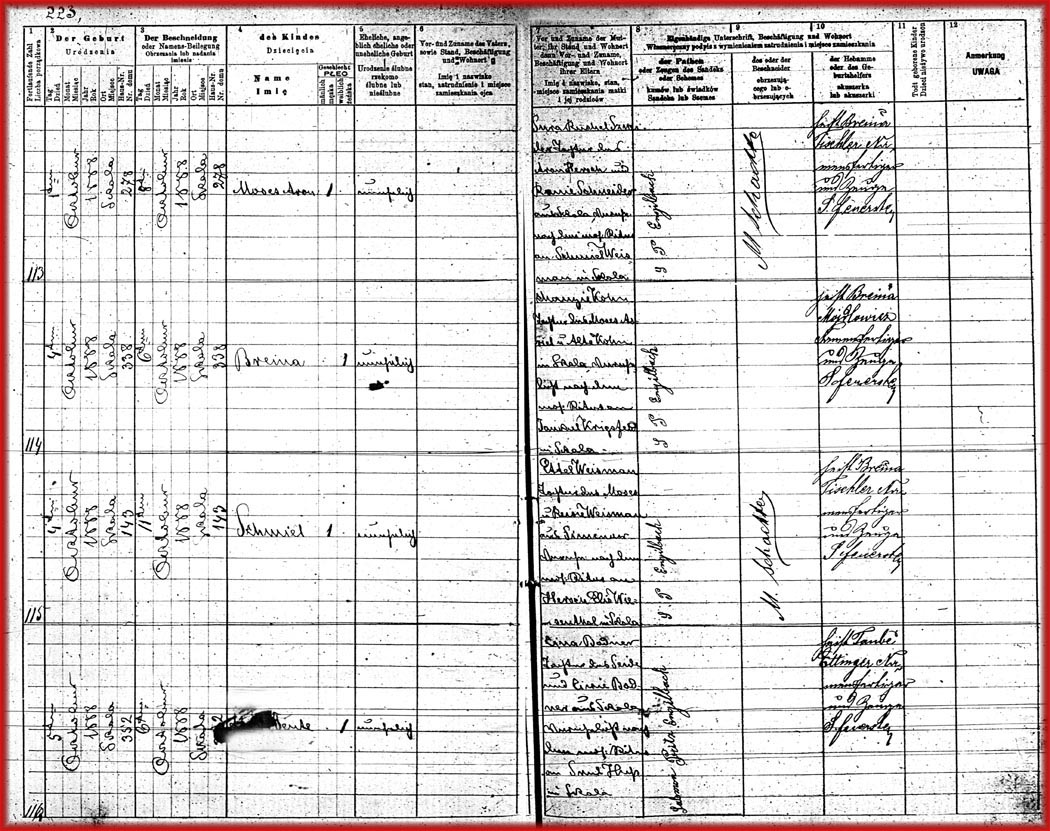 ![]() These entries, from an October, 1888 Skala register, record the births of: Moses Aron, son of Schmiel WEISMAN and Sura Ruchel SZNEIDER; Breina, daughter of Jankiel KRIGSFELD and Chanzie KOHN; Schmiel, son of Ettel WEISMAN and Hersh Elio WIESENTHAL; Freida Jente, daughter of Srul HUSS and Cima BODNER. The mohel for the two boys was M. Schachter; (Abraham Mordechai Schachter-Zwirnbaum). |