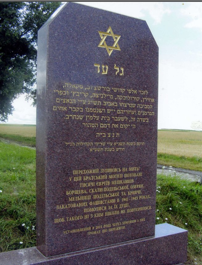 | This is a photograph of a monument erected in Borshchiw to memorialize the 2,500 Jews from Skala, Borshchiw, Korolowka, Ozeryany, Mielnitza, Kryvch and nearby villages who were sent to the Borshchiw ghetto in November 1942 and were murdered by the Nazis and their local collaborators in the Spring of 1943 . The monument replaces one that was dedicated in 1991, which had deteriorated in recent years. The new monument was constructed with the generous support of four survivors of the Holocaust: Michael Edelstein and Max Mermelstein from Skala and brothers Saul and Sam Stermer from Korolowka. |