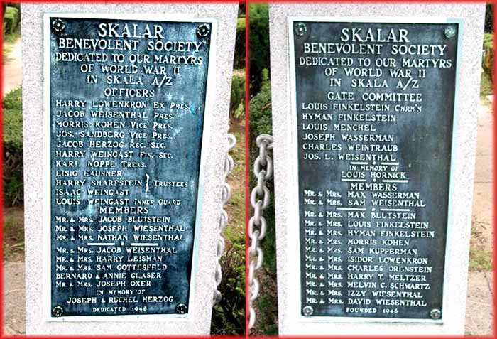 2. Beth David Plaque | This first memorial to the Skala martyrs of World War II was erected in 1946 by the Skala Benevolent Society in Beth David Cemetery in Elmont, New York. The memorials are on either side of the gate to the Skala cemetery plot.