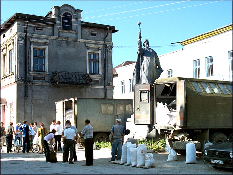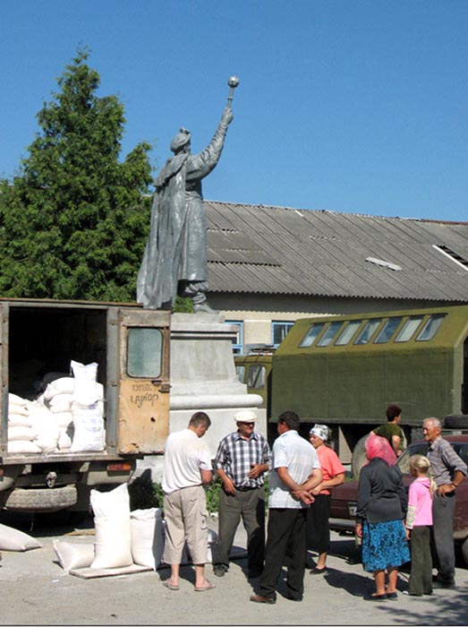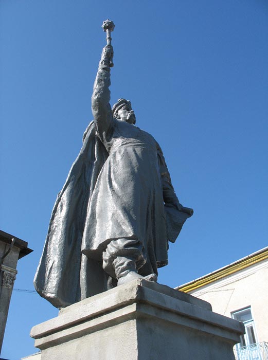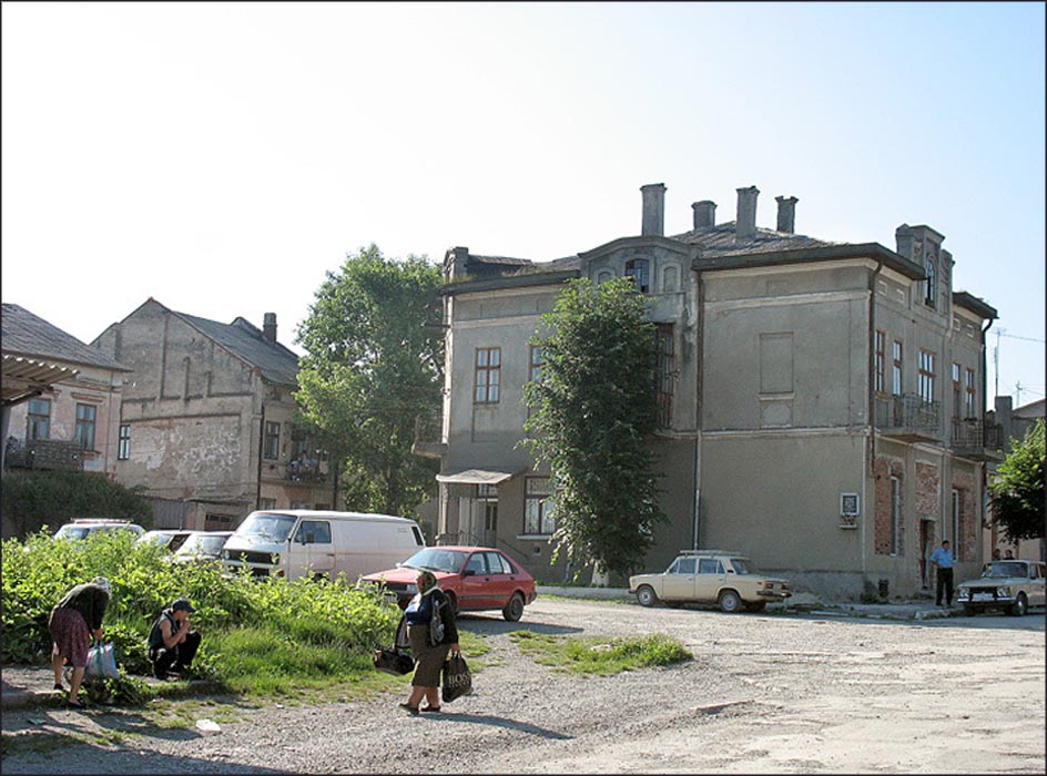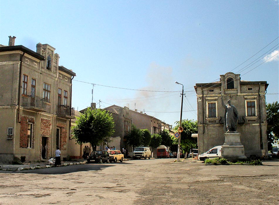 ![]() Entrance to a house in Skala, formerly owned by the Frenkel family | ![]() The bus stop on the road to Chortkov, near the Khmelnitskii monument | ![]() The central square in Skala | ![]() A monument to Bogdan Khmelnitskii |